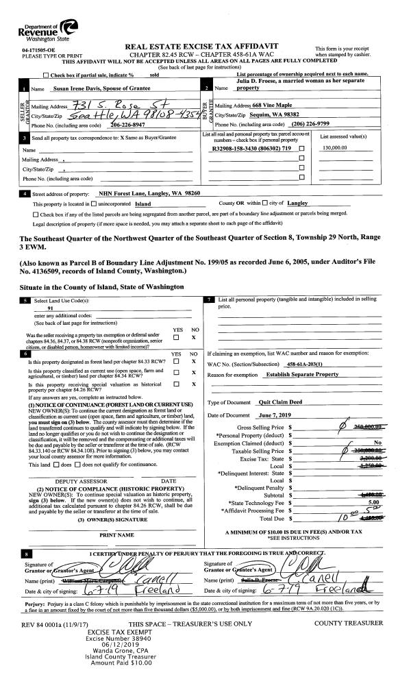 | Mailing Address: | JUDY A OLSON 1647 VIEW HAVEN DRIVE OAK HARBOR, WA 98277 | % Ownership: | 100.0000000000% |