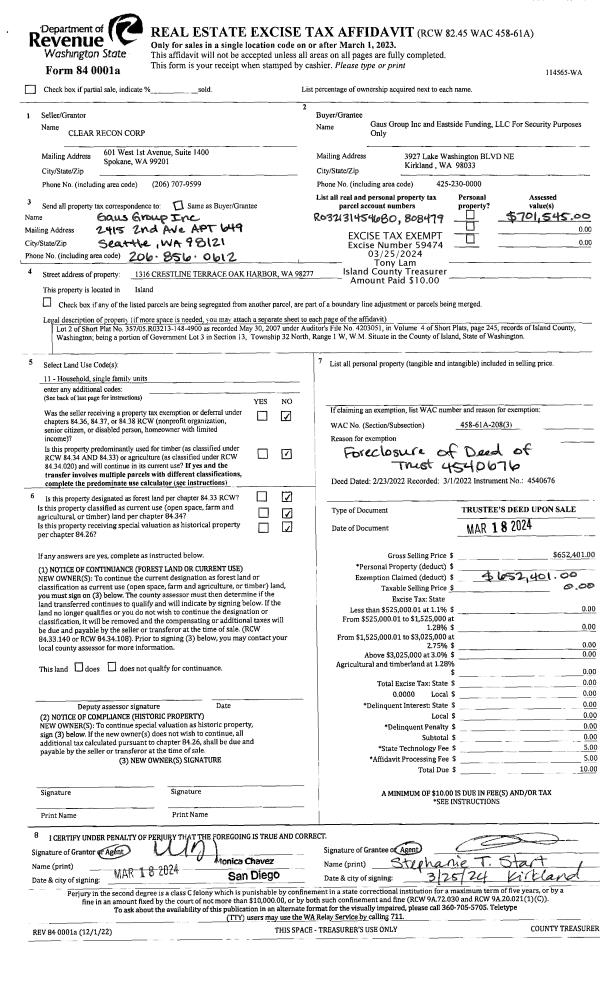 | 4 | 02/11/2010 | TRUSTEED | Trustee's Deed | FRONTIER BANK, | SEATTLE PACIFIC HOMES INC, | | | $0.00 | 367 | 4268990 |