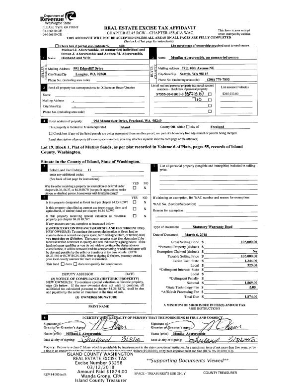 | 2 | 04/19/2011 | WD | Warranty Deed | HABITAT FOR HUMANITY OF ISLAND COUNTY | ISLAND AFFORDABLE HOUSING TRUST | | | $45,000.00 | 4182 | 4293983 |