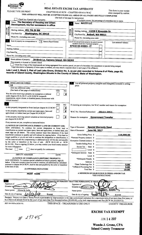 | 1 | 08/28/2017 | WD | Warranty Deed | CRESSMAN III, CHARLES H | ROBINS NEST WHIDBEY, LLC | | | $395,000.00 | 30958 | 4429608 |