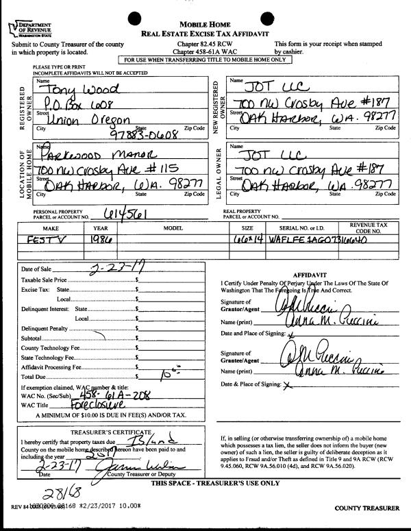 | Mailing Address: | 820 N OAK HARBOR STREET, #39 OAK HARBOR, WA 98277 | % Ownership: | 100.0000000000% |
