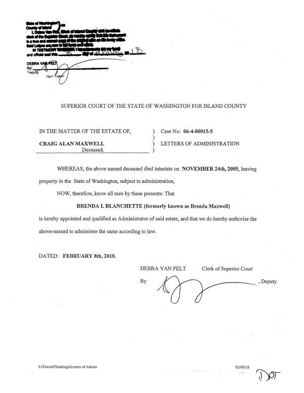 | Mailing Address: | KAROL M. WHITE 1112 AL ANDERSON AVE LANGLEY, WA 98260 | % Ownership: | 100.0000000000% |