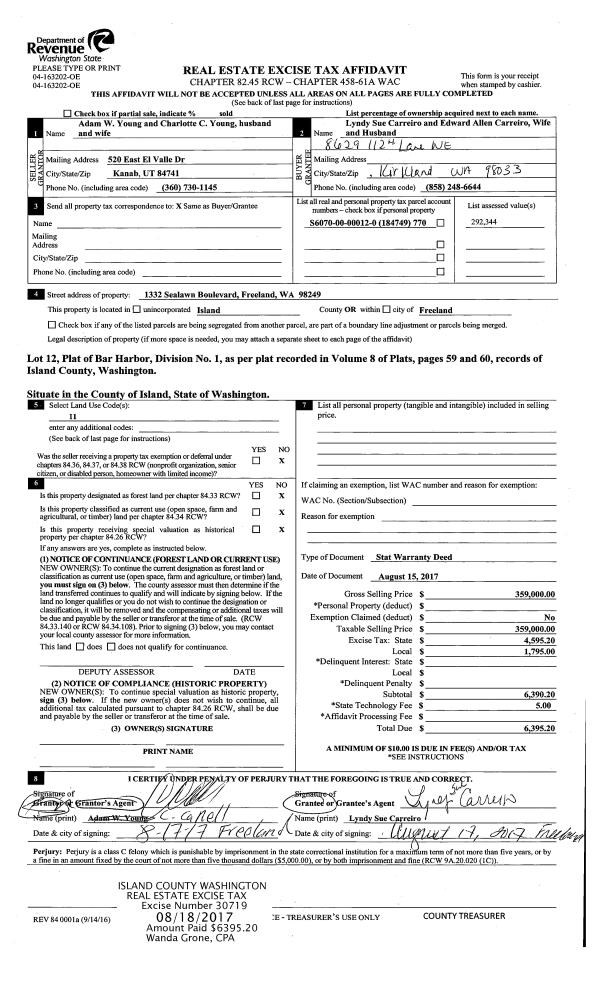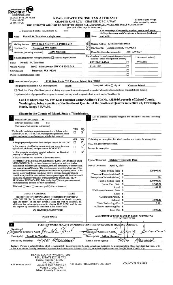 | 1 | 02/12/2018 | WD | Warranty Deed | RANDHAWA FAMILY, LLC | ISLAND COUNTY | | | $1,100,000.00 | 32944 | 4439236 |