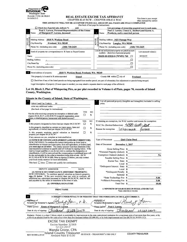 | Mailing Address: | 645 NW ATALANTA WAY #102 OAK HARBOR, WA 98277 | % Ownership: | 100.0000000000% |