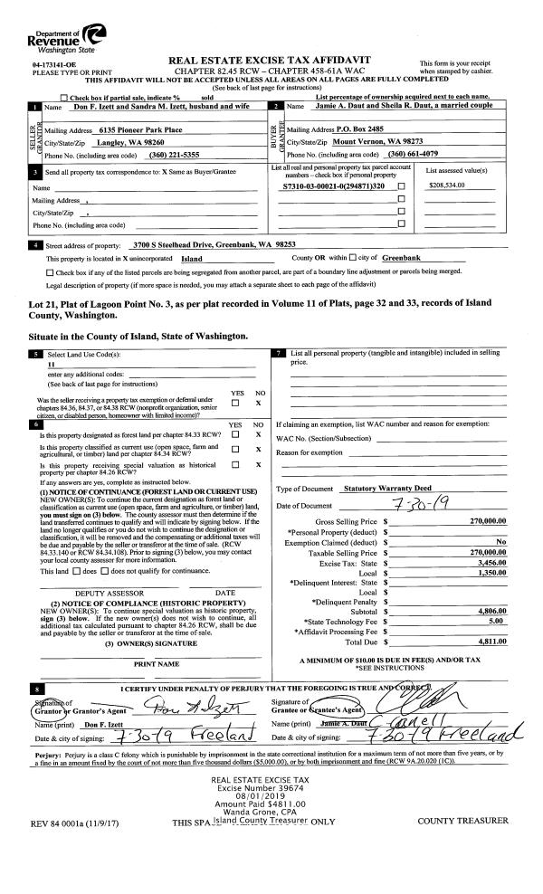 | 3 | 07/24/2019 | WD | Warranty Deed | EAGLE DEVELOPMENT GROUP, LLC | HOLMES HARBOR SEWER DISTRICT | | | $0.00 | 39745 | 4468805 |