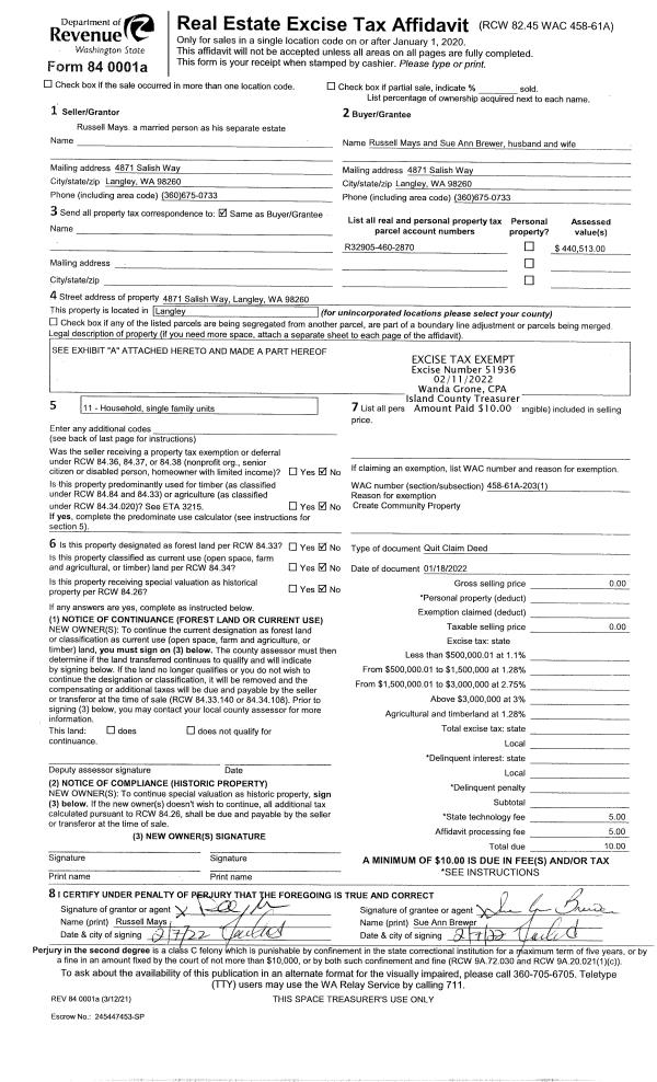 | 1 | 02/22/2021 | WD | Warranty Deed | WUNDORSTAR PROPERTIES LLC | VESPER WAY, CAMANO ISLAND LLC | | | $1,293,800.00 | 47114 | 4512133 |