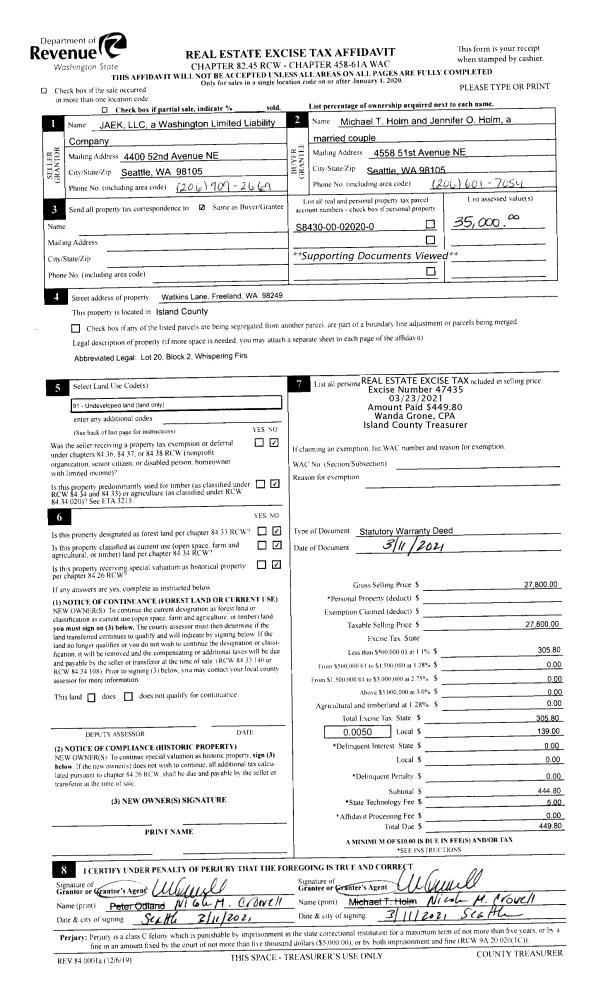 | Tax Area: | 719 - APPRAISER-S Whid Schl Dist, outside Langley, vacant & 50 acres or less | Land Use Code | 91 |