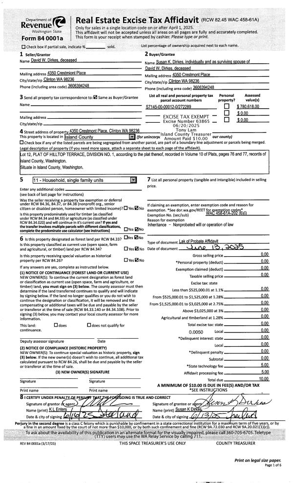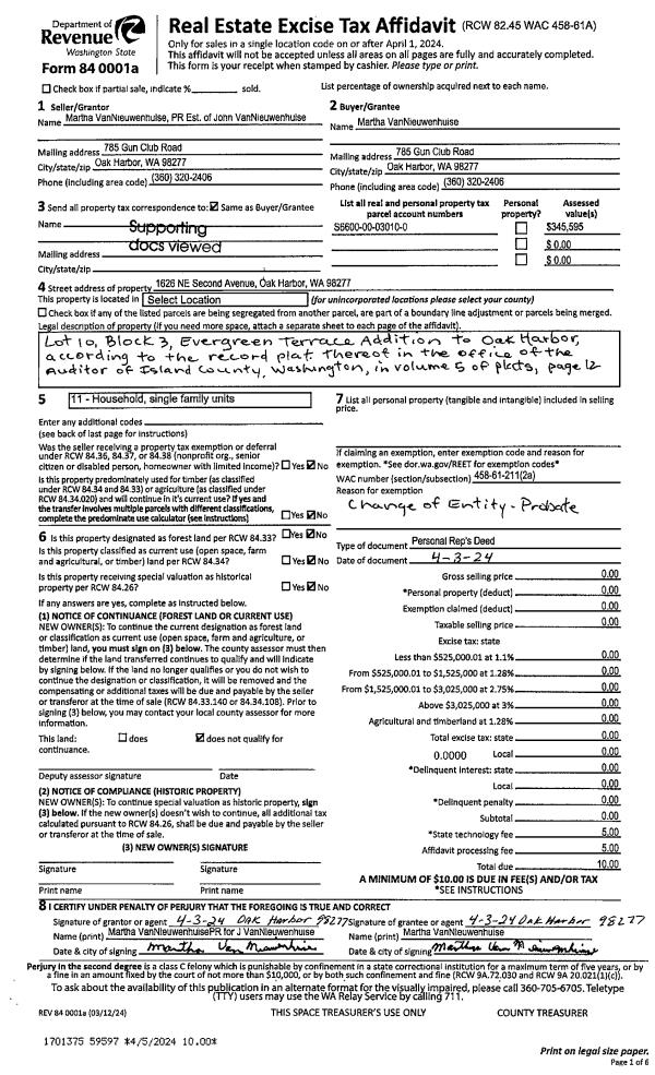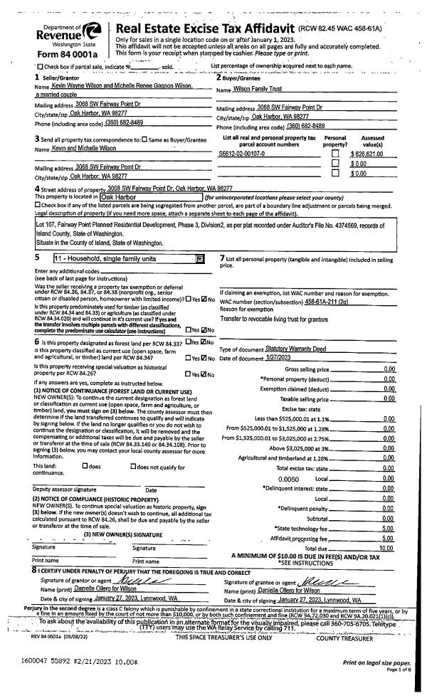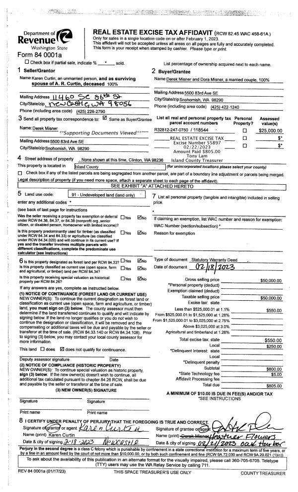 | 1 | 09/18/2024 | EZ | Easement | WHIDBEY CAMANO LAND TRUST | WHIDBEY CAMANO LAND TRUST | | | $1,250,000.00 | 61344 | 4577369 |