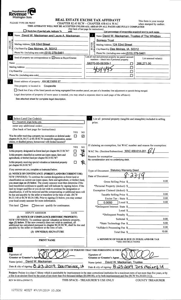 | 5 | 08/21/2019 | WD | Warranty Deed | WEST TTEE, GARY D | GARY D WEST FAMILY, LLC (90%) | | | $0.00 | 40271 | 4472751 |