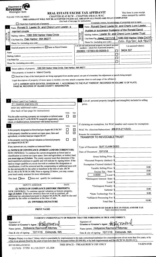 | Mailing Address: | 31 WEST NORTH CAMANO DR CAMANO ISLAND, WA 98282 | % Ownership: | 100.0000000000% |