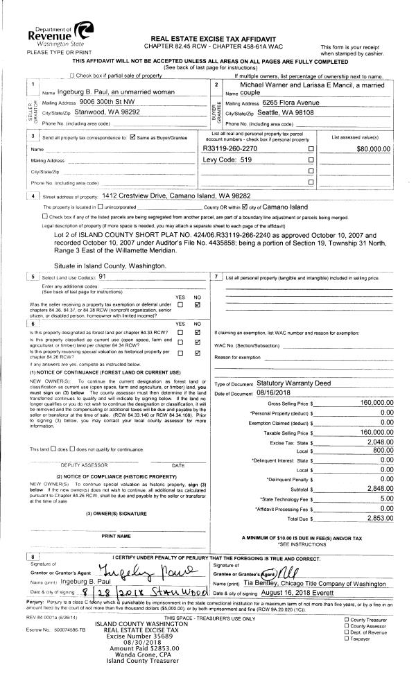 | Mailing Address: | ALYCIA SANDVEN 242 MILE HIGH DR CAMANO ISLAND, WA 98282 | % Ownership: | 100.0000000000% |