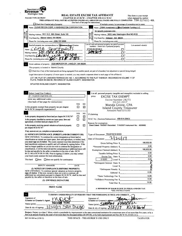 | Mailing Address: | 957 PASSAGE LN CAMANO ISLAND, WA 98282 | % Ownership: | 100.0000000000% |
