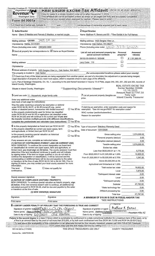 | Mailing Address: | 956 PASSAGE LN CAMANO ISLAND, WA 98282 | % Ownership: | 100.0000000000% |