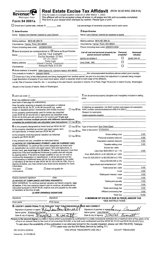 | Mailing Address: | YOSHIKO F WATSON 332 N CAMANO RIDGE RD CAMANO ISLAND, WA 98282 | % Ownership: | 100.0000000000% |